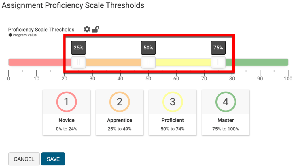 This setting defines what assignment score directly relates to each level of the Proficiency Scale. Adjusting the sliders (1) defines the default range of scores for each level of the Proficiency Scale. Unless the proficiency scale threshold defaults are locked at any level of the Organizational Hierarchy, these settings will also be configurable at the course or course section level.