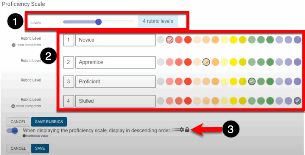 The amount of levels on the scale can be increased or decreased (1) and the numeric value, description, and color of each level (2) can be edited. When displayed on reports, proficiency scale levels are automatically displayed in ascending order; when the When Displaying the Proficiency Scale, Display in Descending Order (3) is enabled, proficiency scale levels will display is descending order.