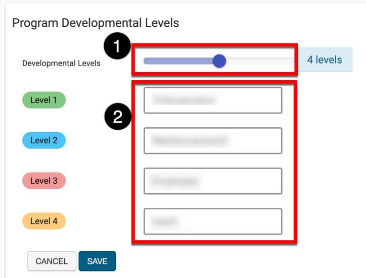 Program Developmental Levels dictate what level of detail an outcome is taught throughout a course; and, they offer more granular reporting capabilities when utilizing the platform’s Report Library. Default values can be locked and are then inherited downstream through the organizational hierarchy. If Program Development Levels have not been locked, the numbers of levels (1) and their titles (2) can be edited.