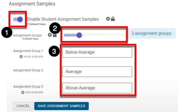 When enabled (1), the Course Section Assignment Samples page will allow for the upload of assignment examples. By default, three assignment sample groups (2) are available and additional groups can be added as needed. Default titling for the default three assignment groups define levels of Below Average, Average, and Above Average and can be edited (3).