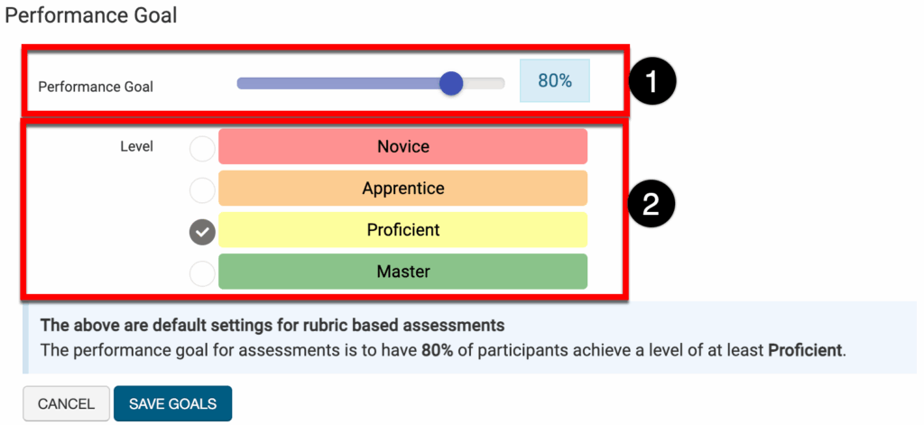 These settings define a default goal based on the program’s Proficiency Scale configuration; this goal is the target Students will be expected to achieve for program success. The performance goal can be set (1) and then a rubric level chosen (2). In the screenshot below, 80% of students will need to achieve the rubric level of Proficient for the program to be considered a success.
